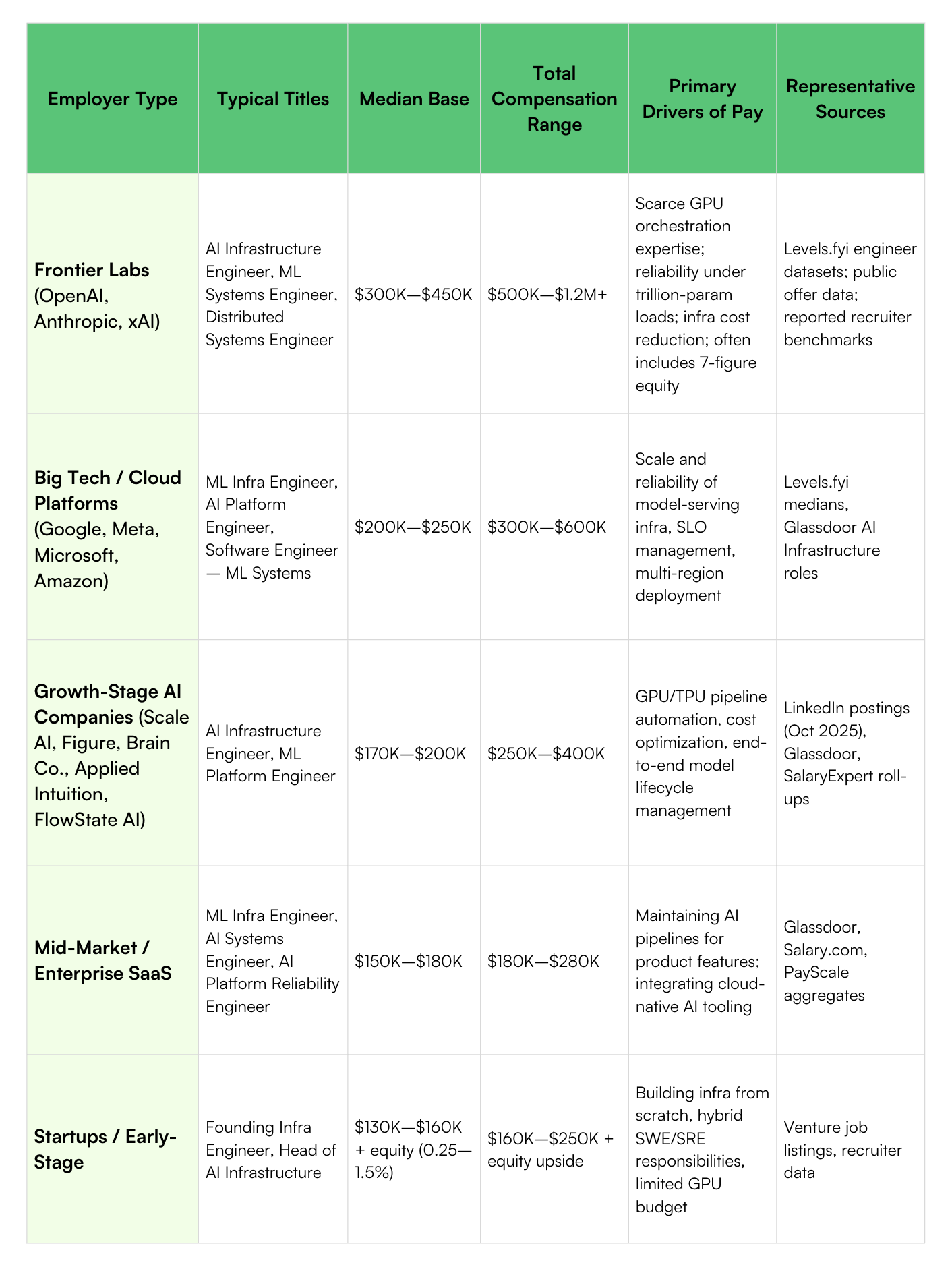 AI infrastructure has officially entered top-tier compensation territory. At the frontier labs, total packages now rival or exceed those of AI researchers. At mainstream companies, pay bands have climbed enough to pull seasoned DevOps and SRE talent into the AI ecosystem.